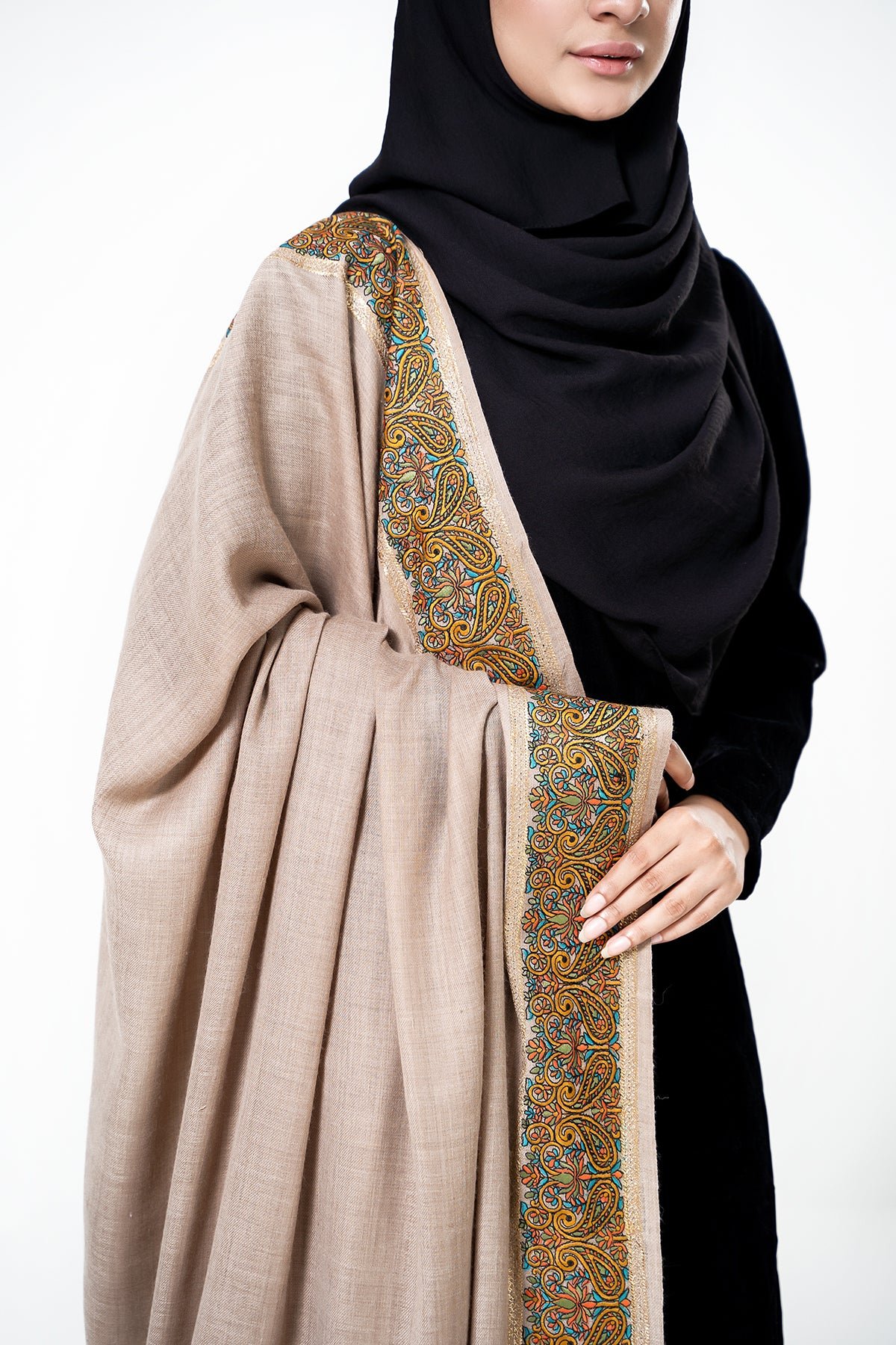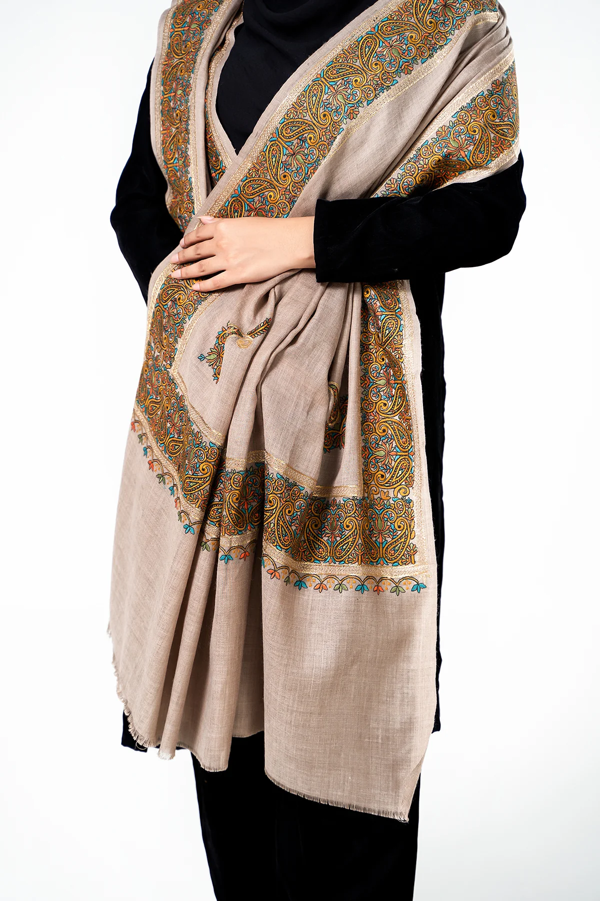 Where timeless craftsmanship meets luxurious design, this Pashtush shawl is a true celebration of heritage and elegance. Handwoven from 100% Grade A Cashmere in the northern regions, its ultra-soft texture and refined detailing reflect generations of artisanal mastery. Intricate embroidery by skilled hands adds a layer of charm, turning each fold into a graceful expression of style and warmth. A perfect companion for winter, designed to elevate your wardrobe with sophistication and tradition.