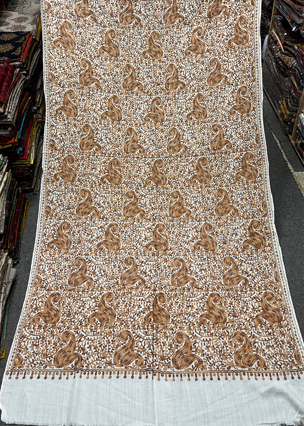 This exquisite Ivory Golden Paisley Shawl features a luxurious off-white base adorned with intricate golden-brown paisley and vine embroidery.