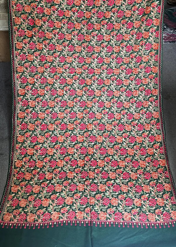 Elevate your winter style with this elegant off-white Kashmiri shawl, richly adorned with multicolor floral embroidery in hues of red, orange, pink, and green.
