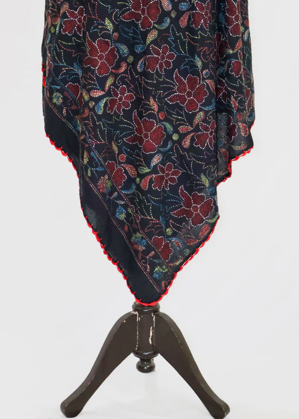 Ruhani is a lightweight lawn shawl adorned with delicate Kacha Tanka floral embroidery